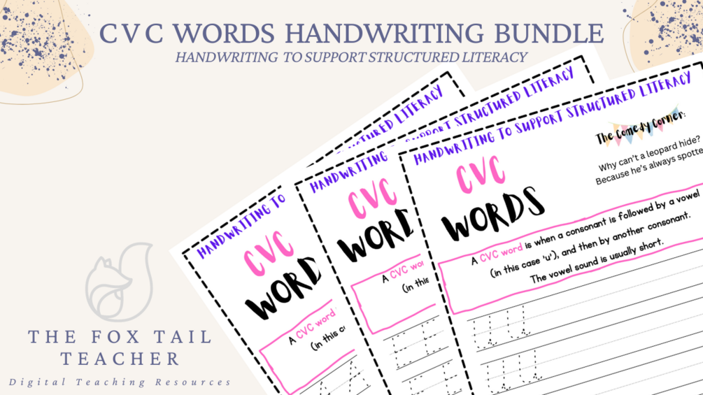 Introducing our CVC Words Handwriting Practice Worksheets, a fun and effective tool for young learners to master the important CVC (consonant-vowel-consonant) rule while improving their handwriting skills. These engaging worksheets provide a clear explanation of the CVC rule and offer ample practice opportunities for writing CVC words, reinforcing phonics lessons and promoting fine motor skill development. Plus, we've added delightful jokes on each worksheet to keep the learning atmosphere light and enjoyable. Whether you're a teacher, parent, or tutor, our downloadable and printable CVC Words Handwriting Practice Worksheets are the perfect resource to support early literacy skills and penmanship proficiency. Get ready to see your students confidently write CVC words with ease—purchase your worksheets today!